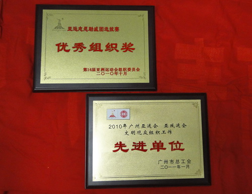領(lǐng)導(dǎo)的鼓勵(lì)激發(fā)起“廣藥潘高壽志愿者助威團(tuán)”全體人員的進(jìn)一步熱情,團(tuán)員加倍努力。在10月23、24日的晉級(jí)比賽中,“廣藥潘高壽志愿者助威團(tuán)”在“機(jī)關(guān)企事業(yè)單位版塊志愿助威團(tuán)晉級(jí)賽”中,在全省近100支團(tuán)隊(duì)中獲得第8名的好成績(jī),并獲亞組委頒發(fā)“最佳組織獎(jiǎng)”榮譽(yù),新年伊始,又再度獲得廣州市工會(huì)亞運(yùn)會(huì)頒授“亞運(yùn)亞殘運(yùn)文明觀眾組織先進(jìn)集體”獎(jiǎng)。