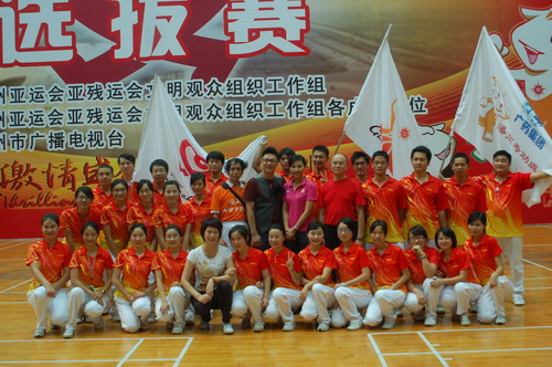 為了在“亞運(yùn)志愿助威團(tuán)選拔賽”取得好的成績(jī),在廣藥集團(tuán)工會(huì)的支持下,我們統(tǒng)一了服裝,制作了亞運(yùn)旗、志愿旗和自創(chuàng)隊(duì)旗。根據(jù)亞組委指定的比賽規(guī)定項(xiàng)目和自選項(xiàng)目開(kāi)展嚴(yán)格的訓(xùn)練。